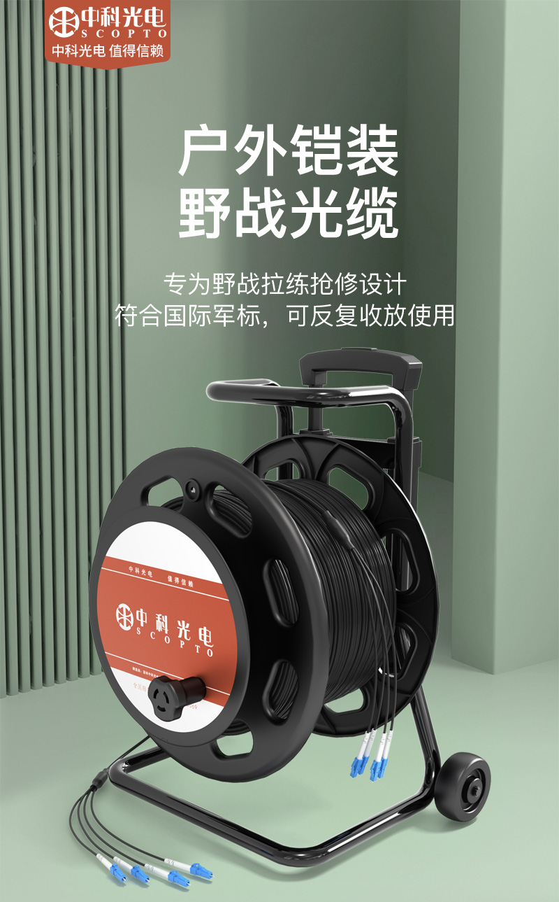 中科光電 單模四芯室外TPU野戰(zhàn)光纜 鎧裝防水基站通信野外拉練搶修  500米+放纜車+LC接口
