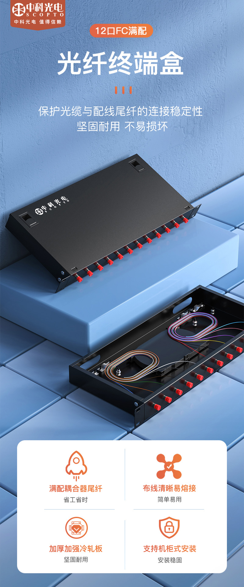 中科光電 光纖終端盒12口 12芯光纖配線架 光纜接續(xù)盒接線熔纖盒 FC多模滿配尾纖法蘭 機架式 ZK-GXH-12FC-MM