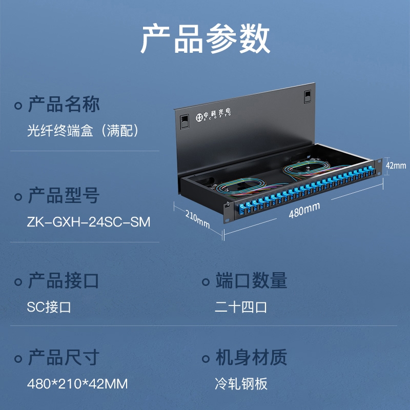中科光電 光纖終端盒24口 24芯光纖配線架 光纜接續(xù)盒接線熔纖盒 SC單模滿配尾纖法蘭 機架式 ZK-GXH-24SC-SM