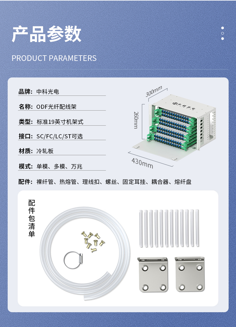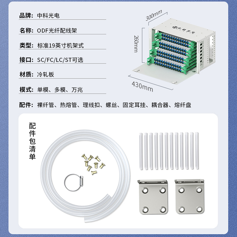中科光電ZK-ODF-96SC-MM-OM4 96芯ODF光纖配線架SC萬兆多模滿配箱 機架式終端盒子框單元體光纜尾纖熔接盤