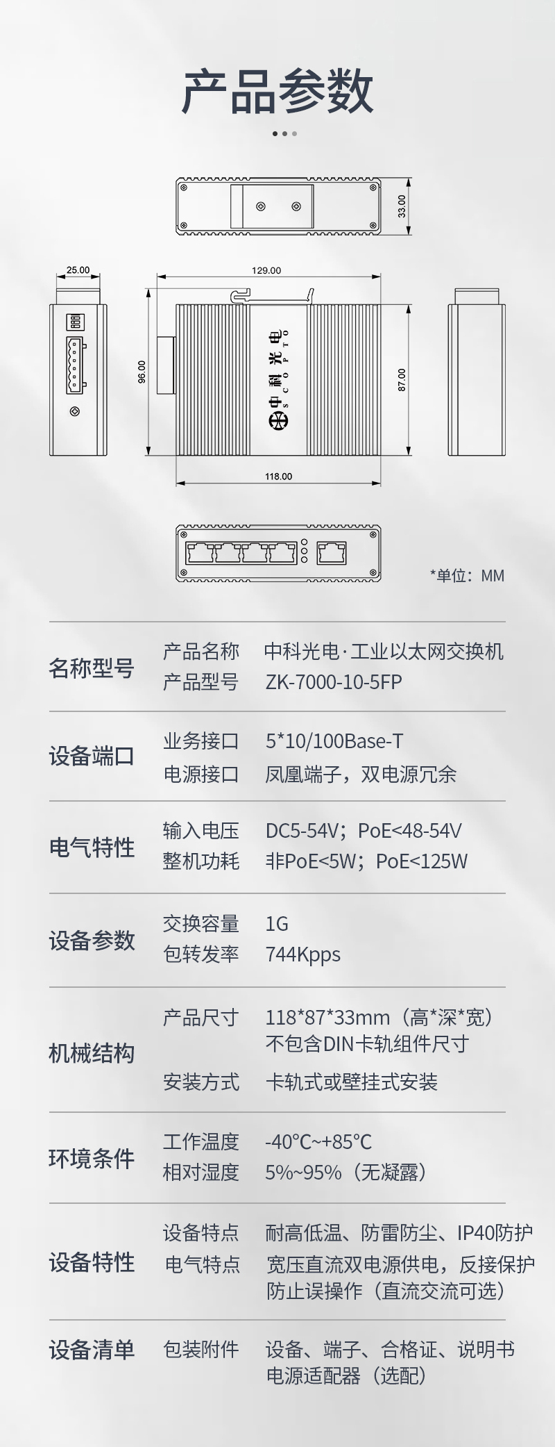 中科光電 POE工業(yè)交換機 5口POE交換機百兆 POE交換機5口 POE供電 工業(yè)級以太網(wǎng)交換機導(dǎo)軌式 ZK-7000-10-5FP