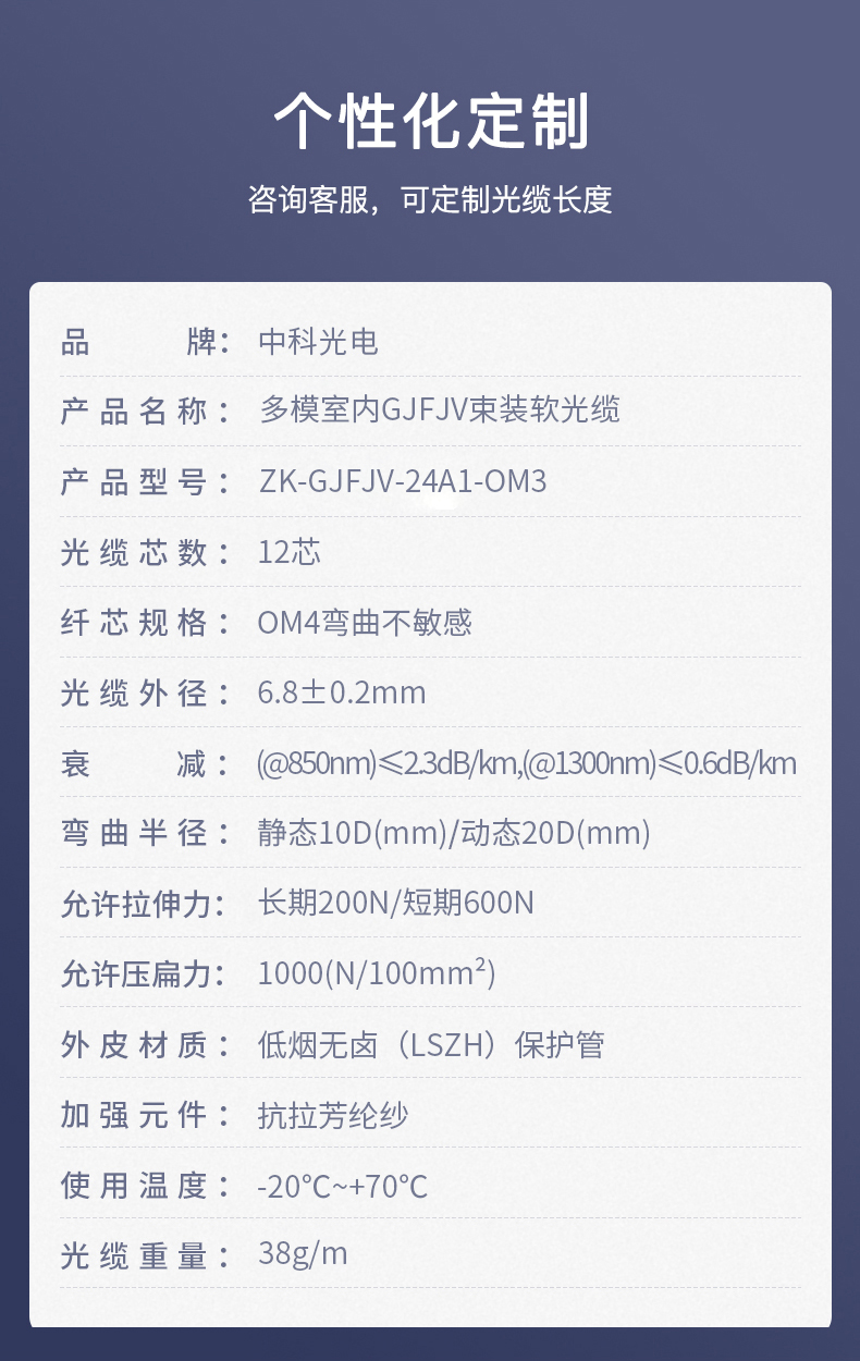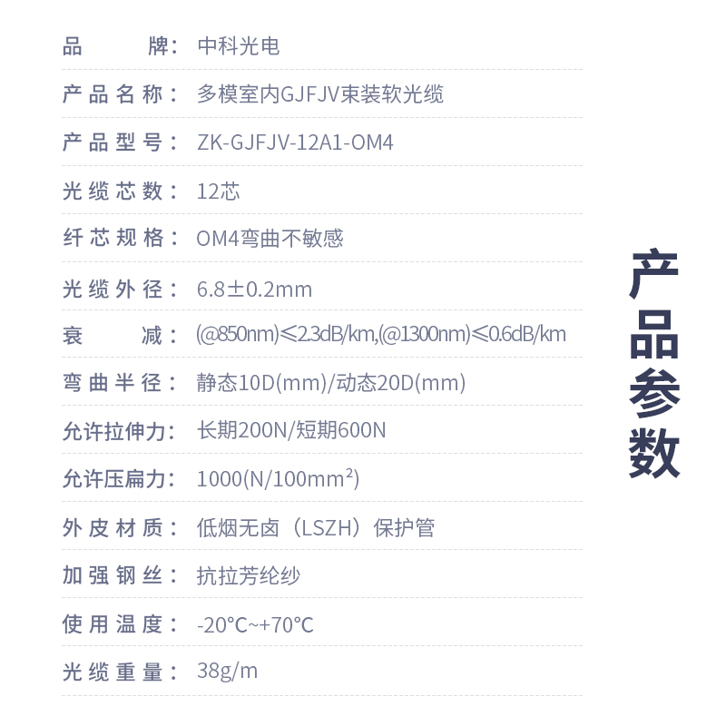 中科光電  12芯OM4萬(wàn)兆多模室內(nèi)網(wǎng)線光纖線 GJFJV束狀軟光纜  可定制長(zhǎng)度