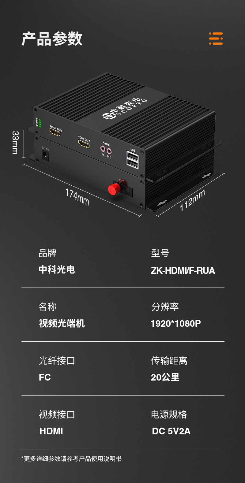 中科光電 非壓縮全高清HDMI視頻光端機(jī) 1路視頻+環(huán)出+USB鍵鼠控制+雙向音頻光纖延長器FC接口 ZK-HDMI/F-RUA