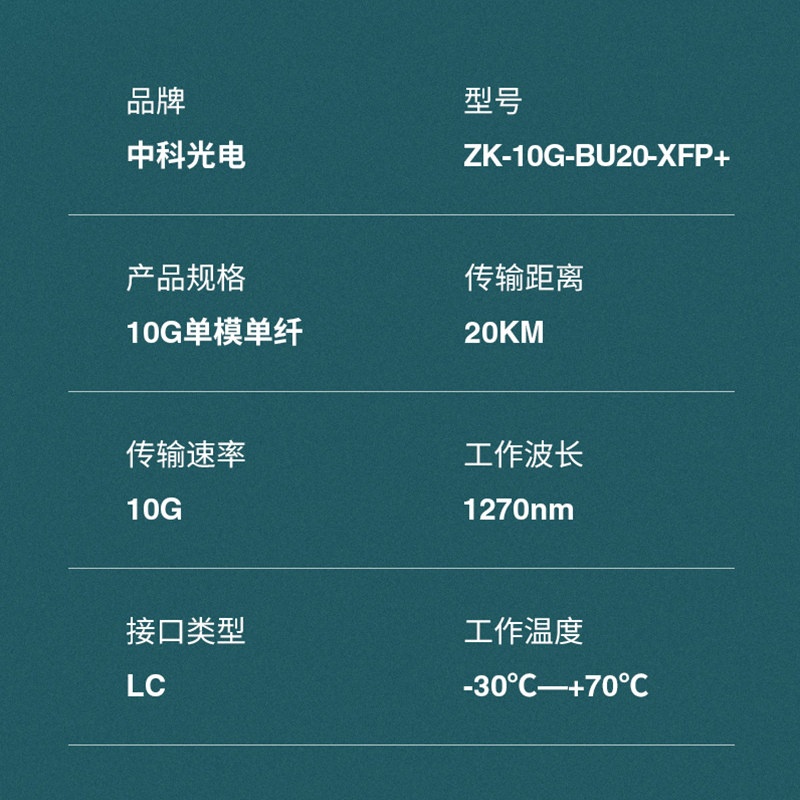 中科光電 XFP光纖模塊萬兆 10G單模單纖(1270nm,20KM,LC)適用各品牌華為華三H3C思科銳捷ZK-10G-BU20-XFP+