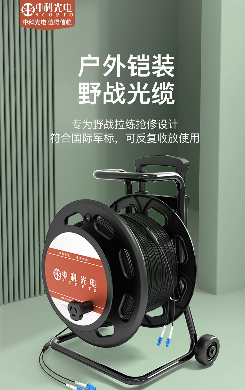 中科光電 單模雙芯室外TPU野戰(zhàn)光纜 鎧裝防水基站通信野外拉練搶修  500米+放纜車+LC接口